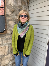 This is the original colourway that Andrea Mowry shows on the pattern. We have kits! It looks great with Lynn's sweater. She says 'Thank You' to Diana for knitting it for her 😋
