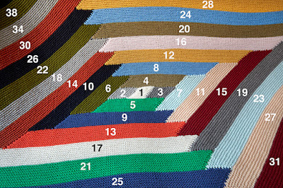 This DK weight blanket is knit from the center outward with DK weight yarn. Each stripe is knit with one color at a time as you pick up stitches from previous sections, resulting in a seamless project. Sixteen colors of West Wool Tandem are featured in the original sample. This design is a great stash buster for your DK weight yarns or you can hold fingering weight double. Use as many colors as you like to customize this cozy garter stitch blanket.You can purchase the pattern on Ravelry or directly from Stephen West. Photos © Stephen West.
