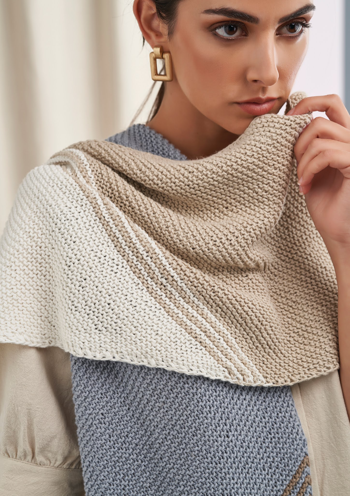 This oversized wrap has a slanted shape which is accented by the dramatic colour block pattern. Knitted in garter stitch throughout, this accessory uses five colours of the beautifully cool Creative Linen.
