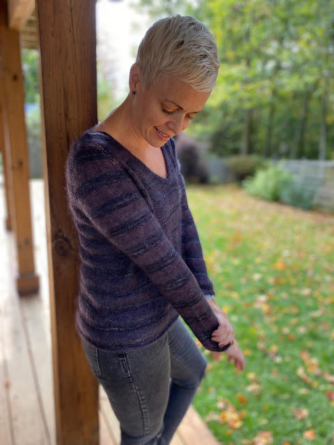 LOVE how this turned out! Light weight and luxurious! So happy with the colour combo. Sometimes simple is best. I did the 4th size and added long sleeves. I picked up the sleeves as directed then knit 2 stripes (16 rows) before decreasing 2 stitches every 8 rows until desired sleeve length.
