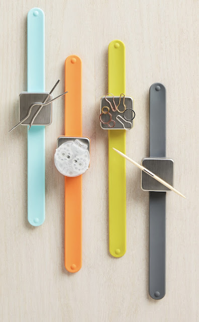 These are the Maker’s Keep.One of the many advantages to knitting is that you can take it with you everywhere! And, in the process, lose little knitting notions everywhere! I wanted a way to truly contain all my knitting tools while traveling – so I came up with the Maker’s Keep magnetic bracelet. It is a slap-bracelet so it fits everyone (one size truly fits all here). You can wear it, or simply drop it in your knitting tool bag to keep all the tools together – or even unfurl it and push the magnet to one end to use it as a straight edge while reading down a pattern.