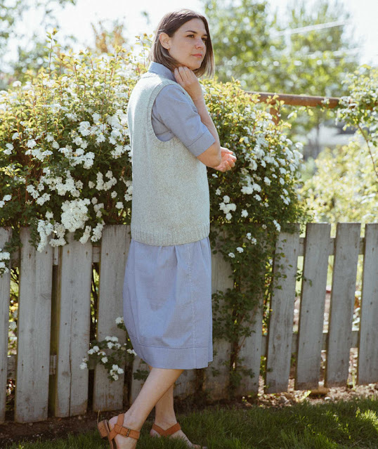 We chose a barely-blue shade of Rowan’s downy Softyak DK. It’s an eminently touchable blend of cool cotton and cloud-soft yak fiber. With a touch of nylon and a chainette construction, it knits into a gently springy fabric (with a lovely drape after a nice rinse). And the palette of calm neutrals, blushing pastels, and moody landscape tones is equal parts pretty and handsome.