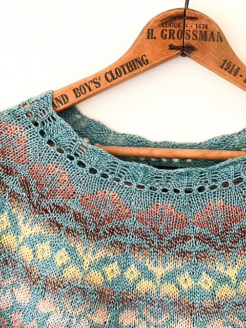 Alpine Bloom is a light summer tee knit from the top down featuring a sweet lace neckline and sleeves and a Scandinavian-inspired floral colorwork yoke. Short rows are worked at the back neck for an improved fit. The sleeves are knitted separately and grafted on. Instructions are given for lengthening the body as desired and for simple ribbed sleeve cuffs if you’d prefer not to graft the sleeves on.